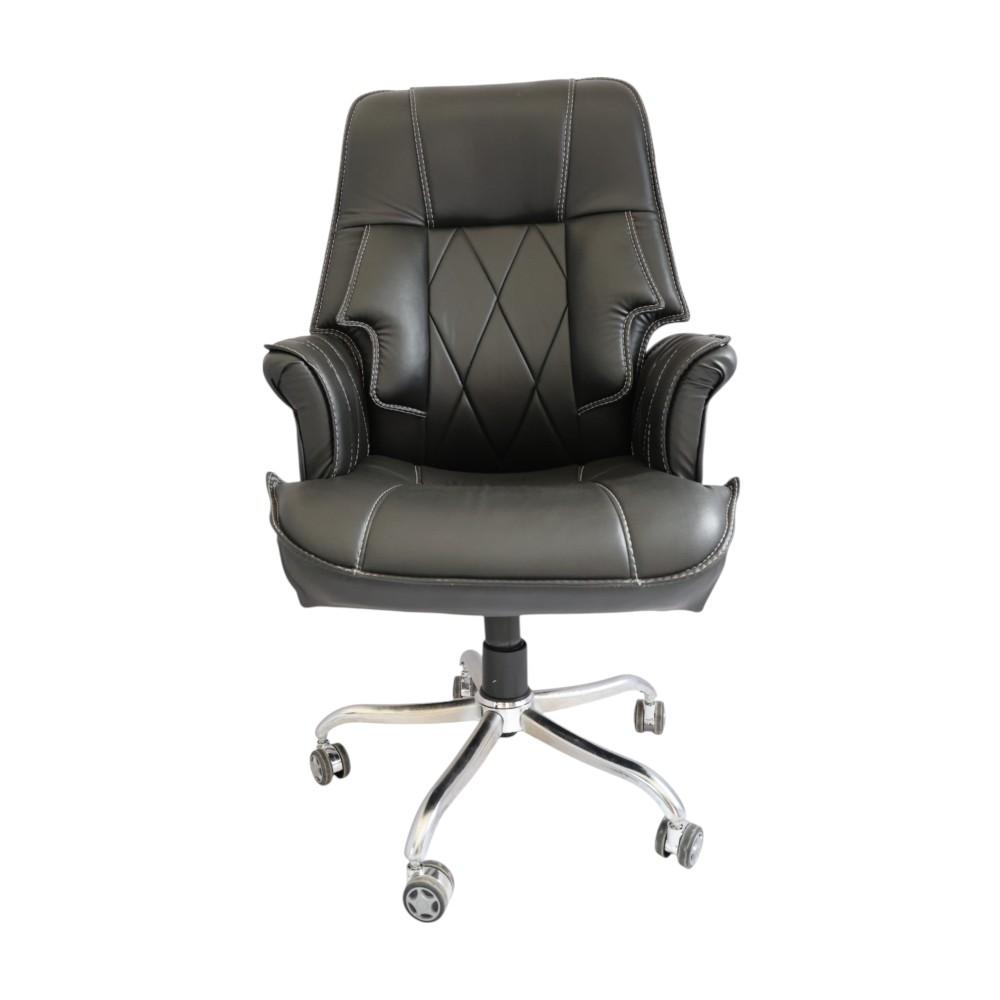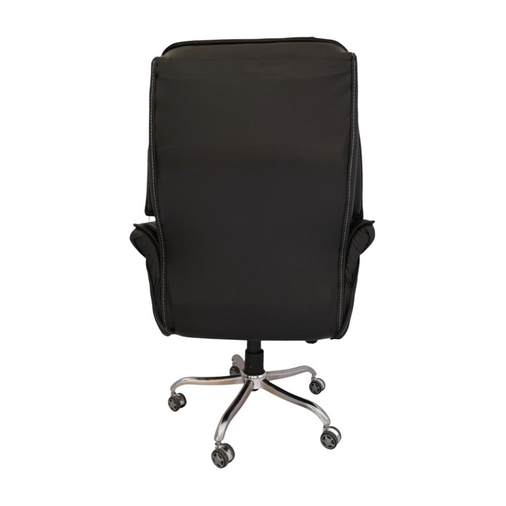 Crafted from rich black leatherette with contrast stitching and diamond patterns, it adds a luxurious vibe to any workspace. The generously padded armrests, contoured backrest, and seat ensure maximum support during long working hours. The chrome-finished base with smooth-rolling caster wheels completes the high-end executive look.
