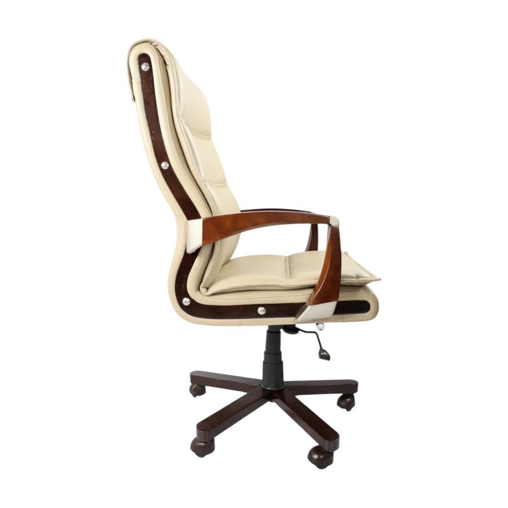 Crafted with premium beige leatherette upholstery, it offers a plush seating experience, while the sculpted wooden armrests and frame add a warm, classic feel. The ergonomic backrest, padded seat, and smooth tilt mechanism ensure all-day comfort and proper posture support.